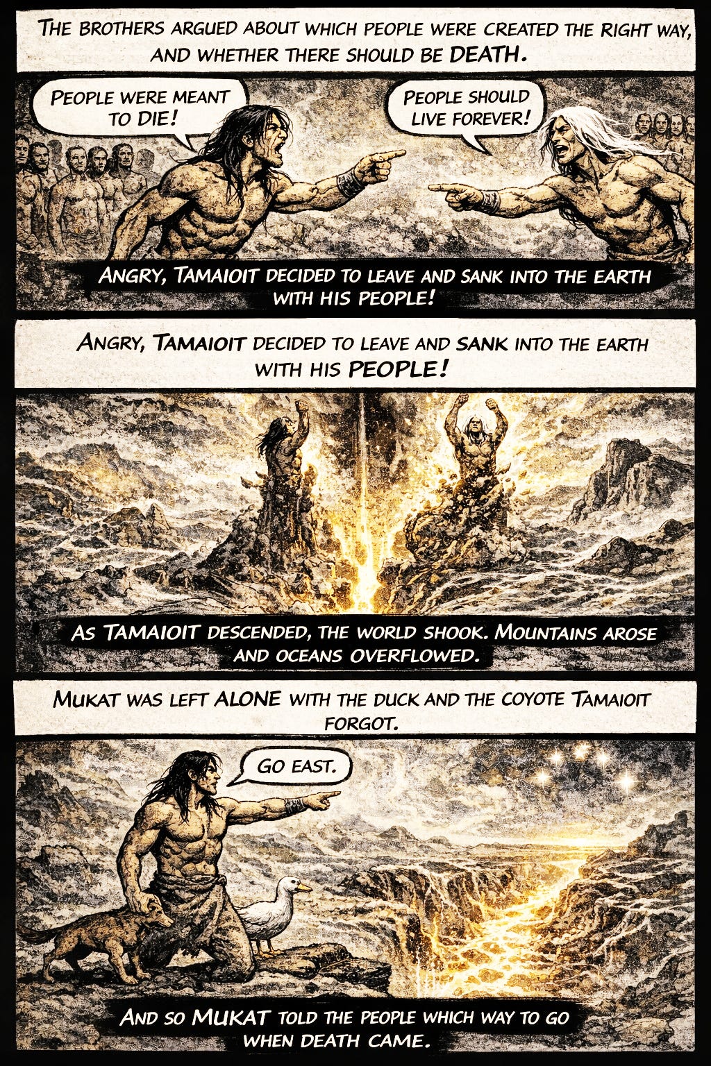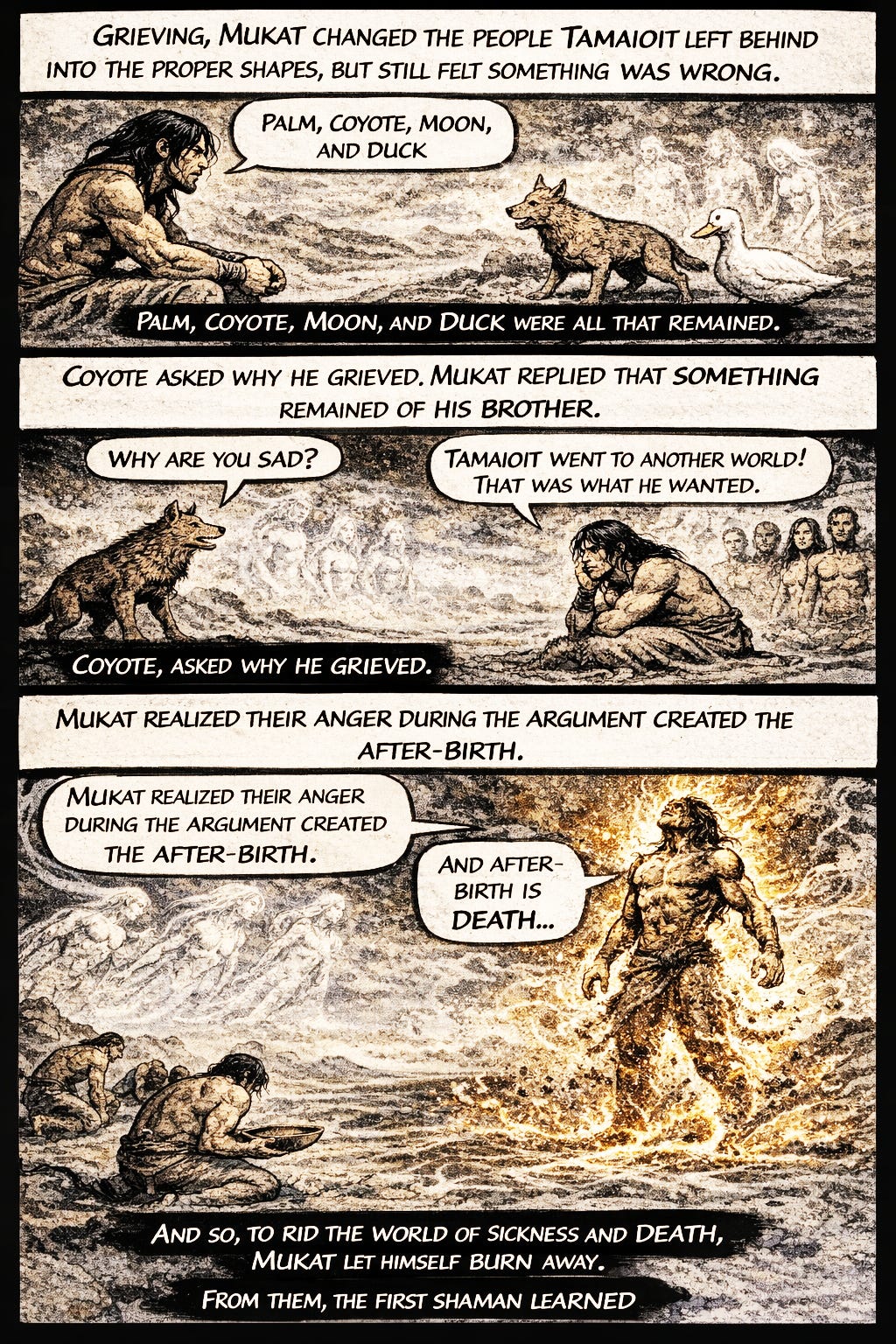 Mukat said it would be better not to die, for the world would get overcrowded and there would not be enough food for all. Tamaioit said they could make both more food and more room to live in. Mukat said it was intended that people should die, for after-birth’s blood was meant to bring disease into the world and thus cause death.