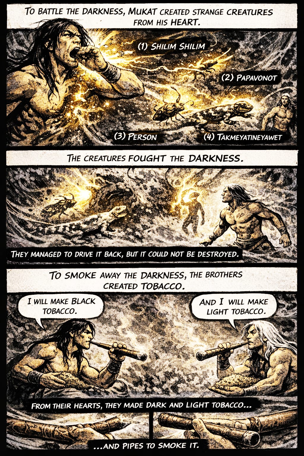 They therefore planned to make tobacco. Mukat took black tobacco from his heart, and Tamaioit brought forth a lighter colored tobacco. Next, they needed some way to smoke it, so they each brought forth another substance from the heart. Mukat’s was dark, Tamaioit’s was light. With this, they made pipes. There were no holes in these pipes, so each pulled out a whisker and pierced a hole in the pipe. Mukat then took a coal of fire from his heart to light the tobacco with. Now they were ready to smoke. Mukat filled his pipe, held it up, and inhaled.