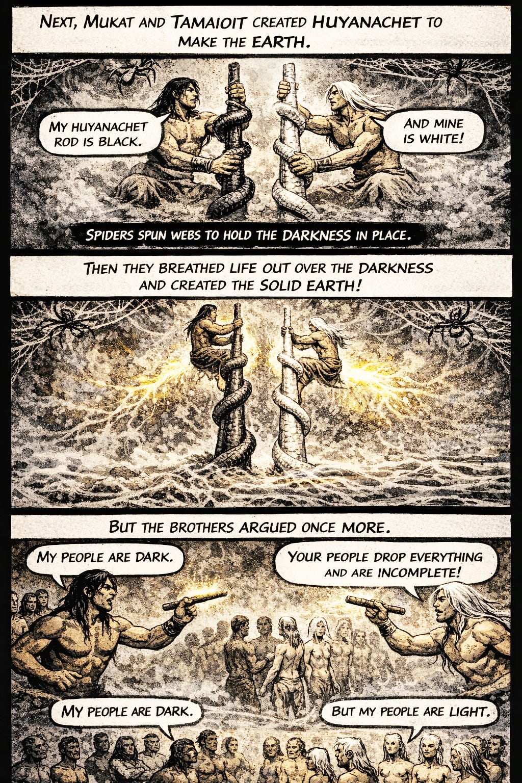 They next took a substance from their hearts to make a huyanachet (rod). As usual, Mukat made a black one and Tamaioit a white one. These were to be the roots of the earth.