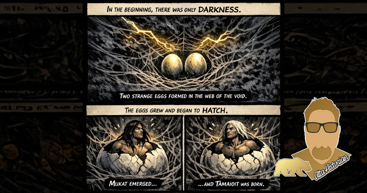 The substances began to grow and soon were two very large eggs. When they began to hatch, they broke at the top first. Two heads came out, then shoulders, hips, knees, ankles, toes; then the shell was all gone. Two boys had emerged: Mukat and Tamaioit. They were grown men from the first, and could talk right away. As they lay there, both heard a noise like a bee buzzing at the same time. It was the song of their mother, Darkness.