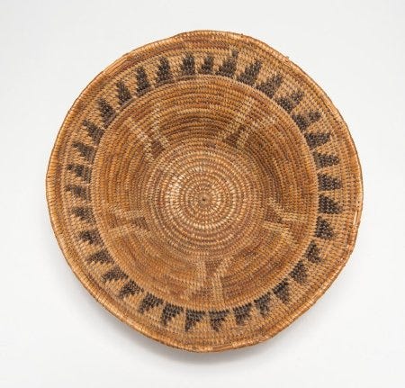 California Native basketry had no equal in the world — not in utility, not in beauty. Confined largely to the southern regions but practiced statewide, baskets were used for gathering, cooking, storing, and even boiling food. Some cooking baskets were sealed with pitch or tar to make them watertight. They were technology disguised as art.