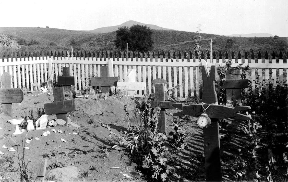 Wooden crosses in cemetery at Mission Assistencia of San Antonio at Pala, ca. 1898.” Photograph. California Historical Society Collection, 1860-1960. Title Insurance and Trust, and C.C. Pierce Photography Collection, 1860-1960. University of Southern California Libraries. https://doi.org/10.25549/chs-m4420.