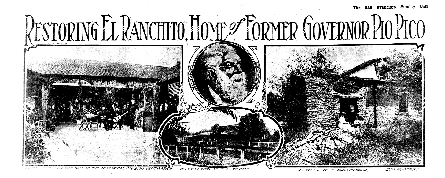 🦶🎵: Alfred Dezendorf, "Restoring El Ranchito, Home of Former Governor Pío Pico," The San Francisco Call (08 Aug. 1909): p. 4.