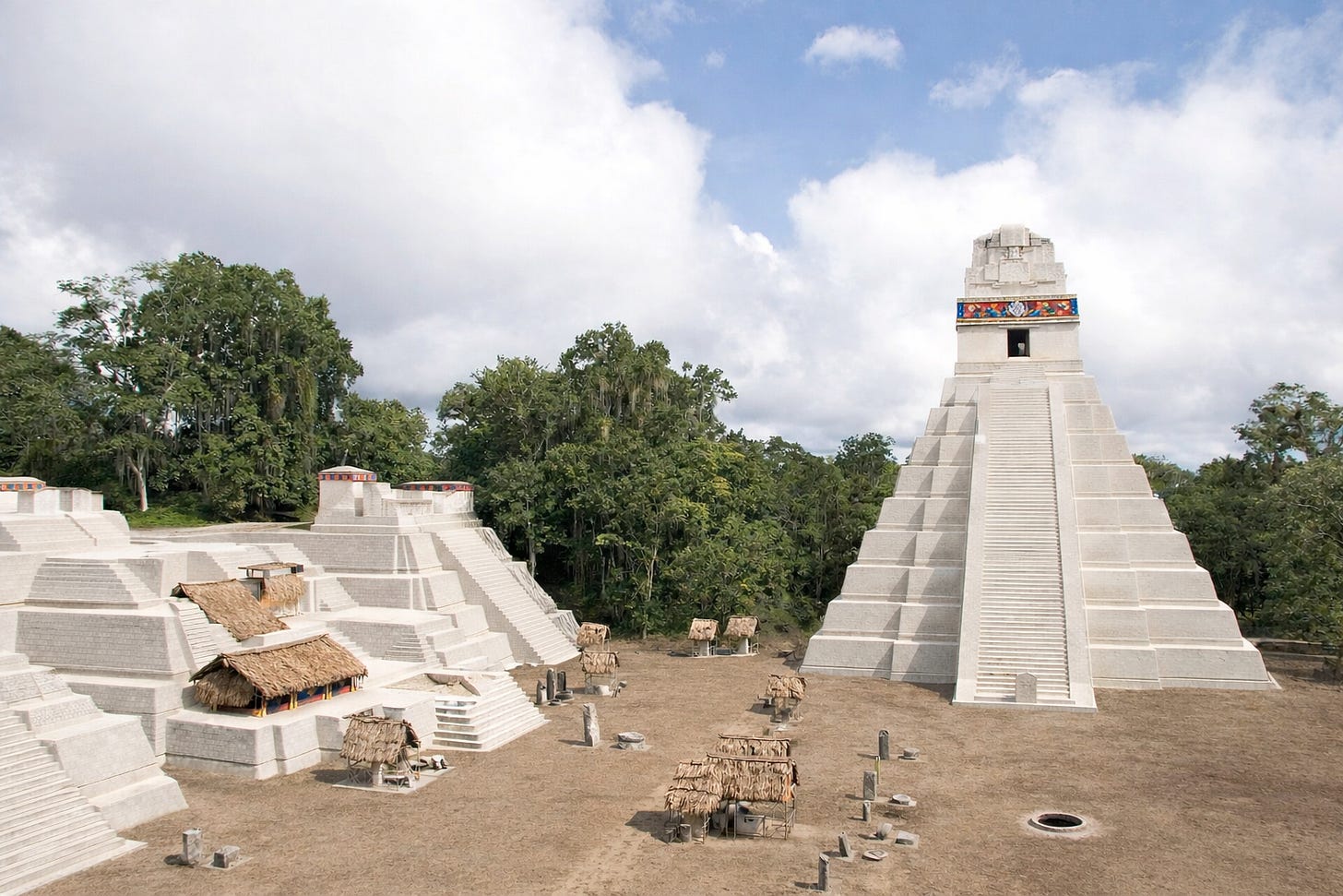 Maya architectural ambition is perhaps best exemplified at Tikal. Between roughly 200 BC and AD 200, Maya architects across the northern Petén constructed broad, low temples with expansive staircases flanked by massive stucco masks. These masks — built from plaster made of burned limestone and modeled over stone frameworks — represented deities and mythological forces, transforming architecture into cosmology made visible.